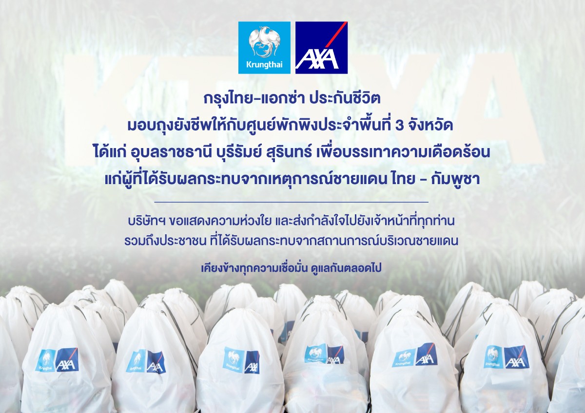 บมจ.กรุงไทย-แอกซ่า ประกันชีวิต ส่งมอบถุงยังชีพจำนวน 300 ชุด เพื่อช่วยเหลือประชาชนที่ได้รับผลกระทบจากสถานการณ์ชายแดนไทย-กัมพูชา โดยถุงยังชีพจะถูกส่งมอบให้ประชาชนผ่านศูนย์พักพิงประจำพื้นที่ 3 จังหวัด ได้แก่ จังหวัดอุบลราชธานี จังหวัดบุรีรัมย์และจังหวัดสุรินทร์ โดยทางบริษัทฯ ขอแสดงความห่วงใย และส่งกำลังใจไปยังเจ้าหน้าที่ทุกท่าน รวมถึงประชาชน ที่ได้รับผลกระทบจากสถานการณ์บริเวณชายแดน ทั้งนี้บริษัทฯ มุ่งมั่น เคียงข้างทุกความเชื่อมั่น ดูแลกันตลอดไป