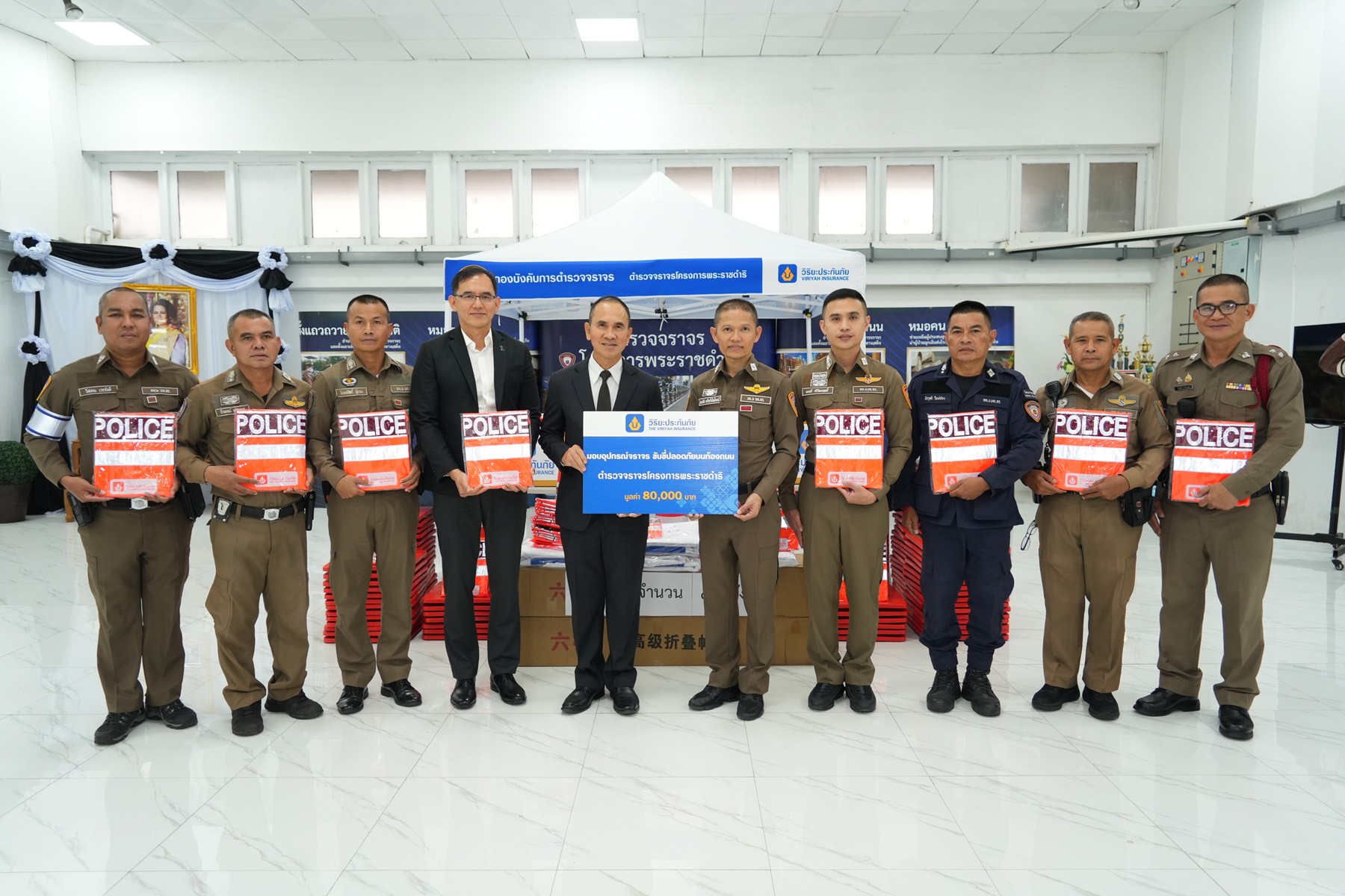 พันตำรวจเอก ประทีป ศรีหรั่งไพโรจน์ ผู้กำกับการ 6 กองบังคับการตำรวจจราจร รับมอบเต็นท์ จำนวน 5 หลัง กรวยยางจราจร จำนวน 100 อัน และเสื้อกันฝนสะท้อนแสง จำนวน 200 ชุด มูลค่ารวม 80,000 บาท จาก บริษัท วิริยะประกันภัย จำกัด (มหาชน) โดยมี พลตำรวจโท จิรสันต์ แก้วแสงเอก ที่ปรึกษางานสินไหมทดแทนรถยนต์ เป็นผู้แทนมอบ เพื่อสนับสนุนการดำเนินภารกิจของตำรวจโครงการพระราชดำริ ในการปฏิบัติหน้าที่อำนวยความสะดวกทางการจราจร ให้ความช่วยเหลือประชาชนที่ประสบเหตุบนท้องถนน รวมถึงปฏิบัติภารกิจฉุกเฉินได้อย่างปลอดภัยและมีประสิทธิภาพ ตอกย้ำความมุ่งมั่นของบริษัทฯ ที่ให้ความสำคัญกับการขับเคลื่อนความปลอดภัยบนท้องถนนทุกมิติ โดยพิธีมอบจัดขึ้น ณ ห้องประชุมกองกำกับการ 6 กองบังคับการตำรวจจราจร เขตจตุจักร กรุงเทพฯ