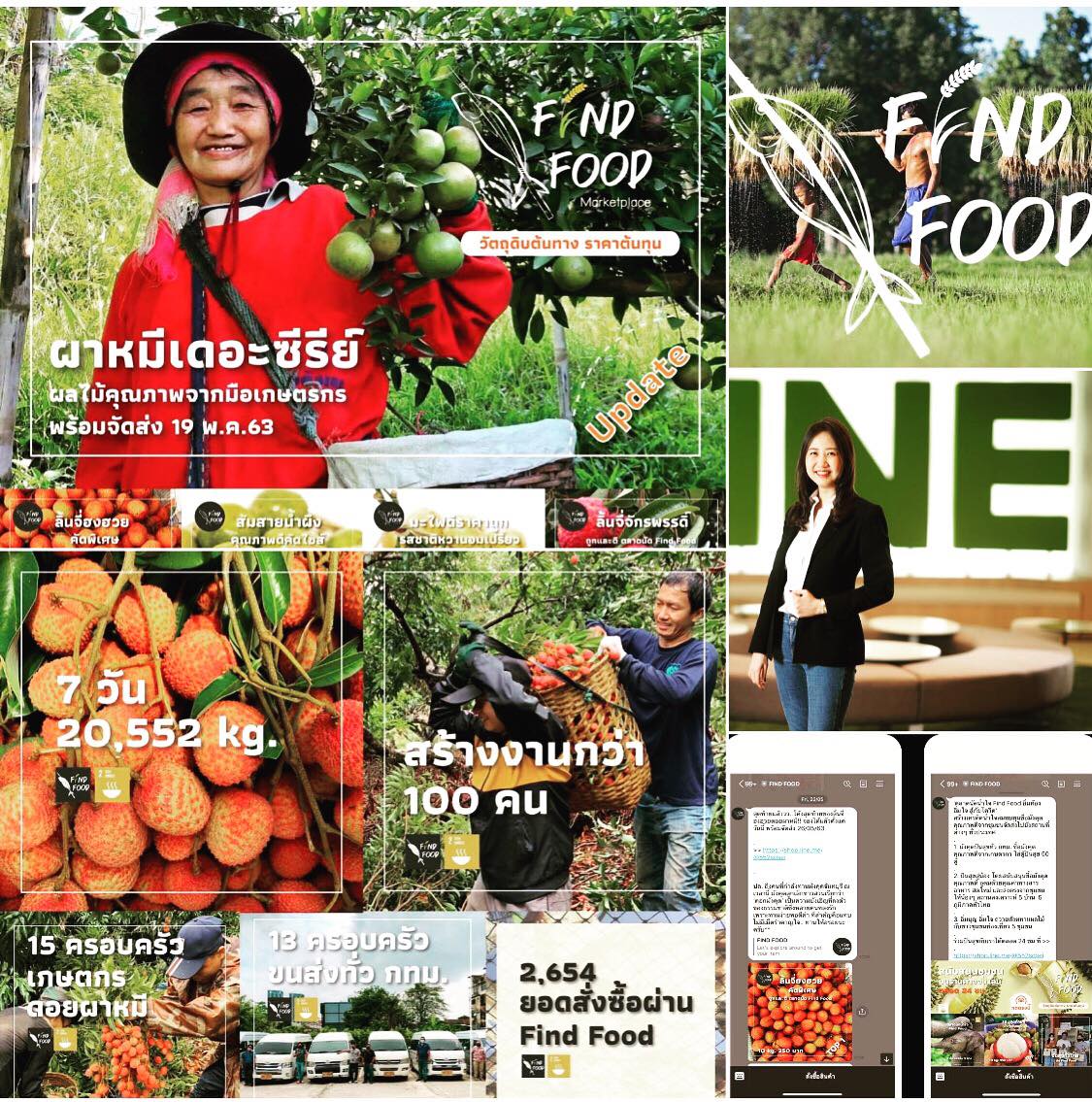 อย่างไรก็ตาม มีหนึ่งแพลตฟอร์มตัวอย่างที่คอยช่วยเหลือเกษตรกรทำหน้าที่เป็นตัวกลางในการทำงานร่วมกับชุมชนในชื่อ ‘Find Food’ ภายใต้คอนเซปต์แหล่งอาหารและวัตถุดิบโดยคนไทยเพื่อคนไทย ด้วยวัตถุดิบต้นทาง ราคาต้นทุน ที่ได้ช่วยให้เกษตรไทยสามารถปรับตัวและพลิกวิกฤตครั้งนี้ให้เป็นโอกาส ด้วยการขยายช่องทางธุรกิจสู่การเกษตรดิจิทัลแบบเต็มตัว ผ่านการใช้ LINE Official Account ร่วมกับเครื่องมือใหม่อย่าง MyShop มาช่วยเหลือเกษตรกรรายย่อยและชุมชนในท้องที่ต่างๆ ให้เกษตรกรสามารถขายและเข้าถึงกลุ่มผู้บริโภคตัวจริงได้โดยตรง โดยมีทีมงานเบื้องหลังเป็นกลุ่มคนรุ่นใหม่ที่คุ้นชินกับการเข้าถึงเทคโนโลยีเป็นอย่างดี1
