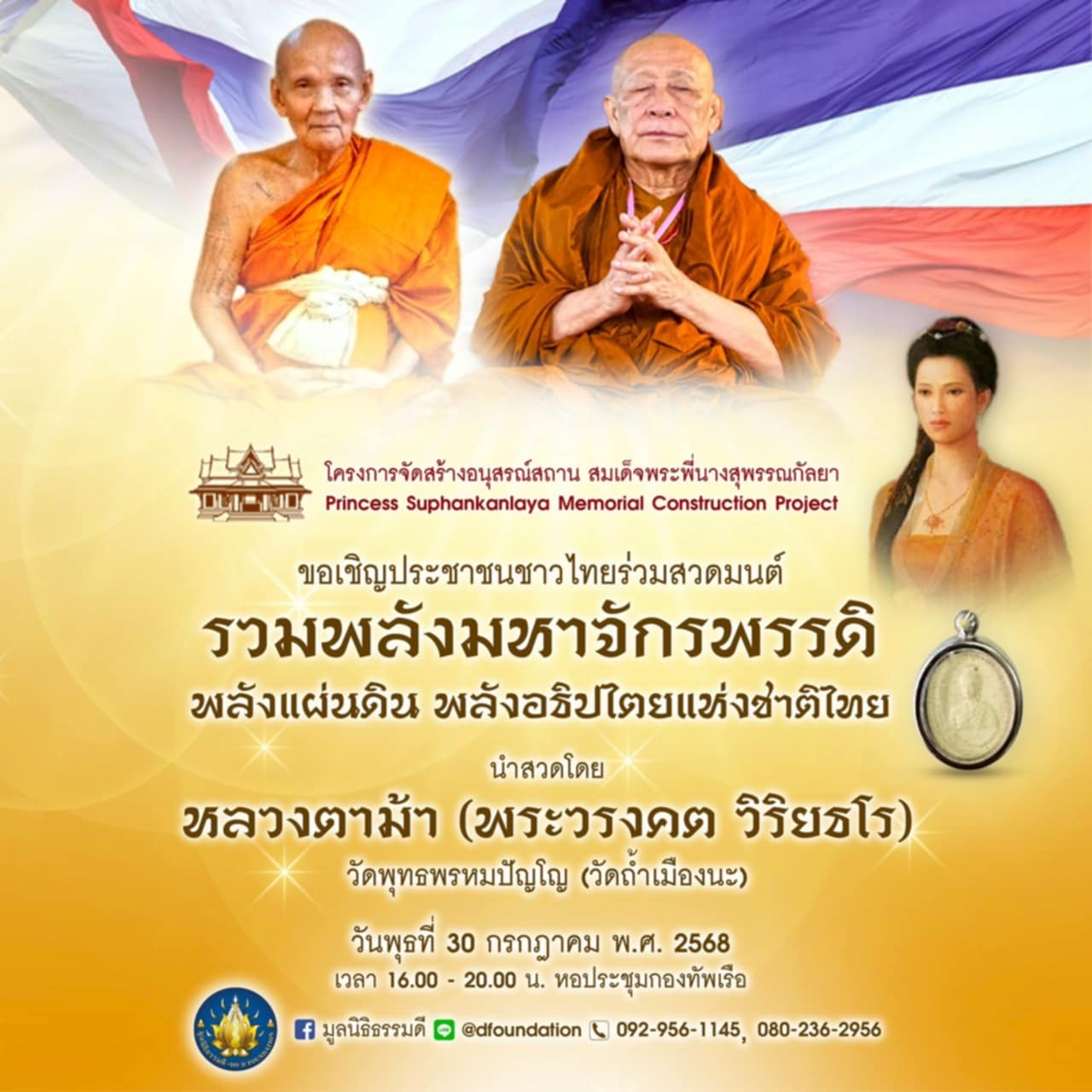 ขอเชิญร่วมสวดรวมพลังมหาจักรพรรดิ พลังแผ่นดิน พลังอธิปไตยแห่งชาติ จัดโดยโครงการจัดสร้างอนุสรณ์สถานสมเด็จพระพี่นางสุพรรณกัลยา วันที่ 30 ก.ค.นี้