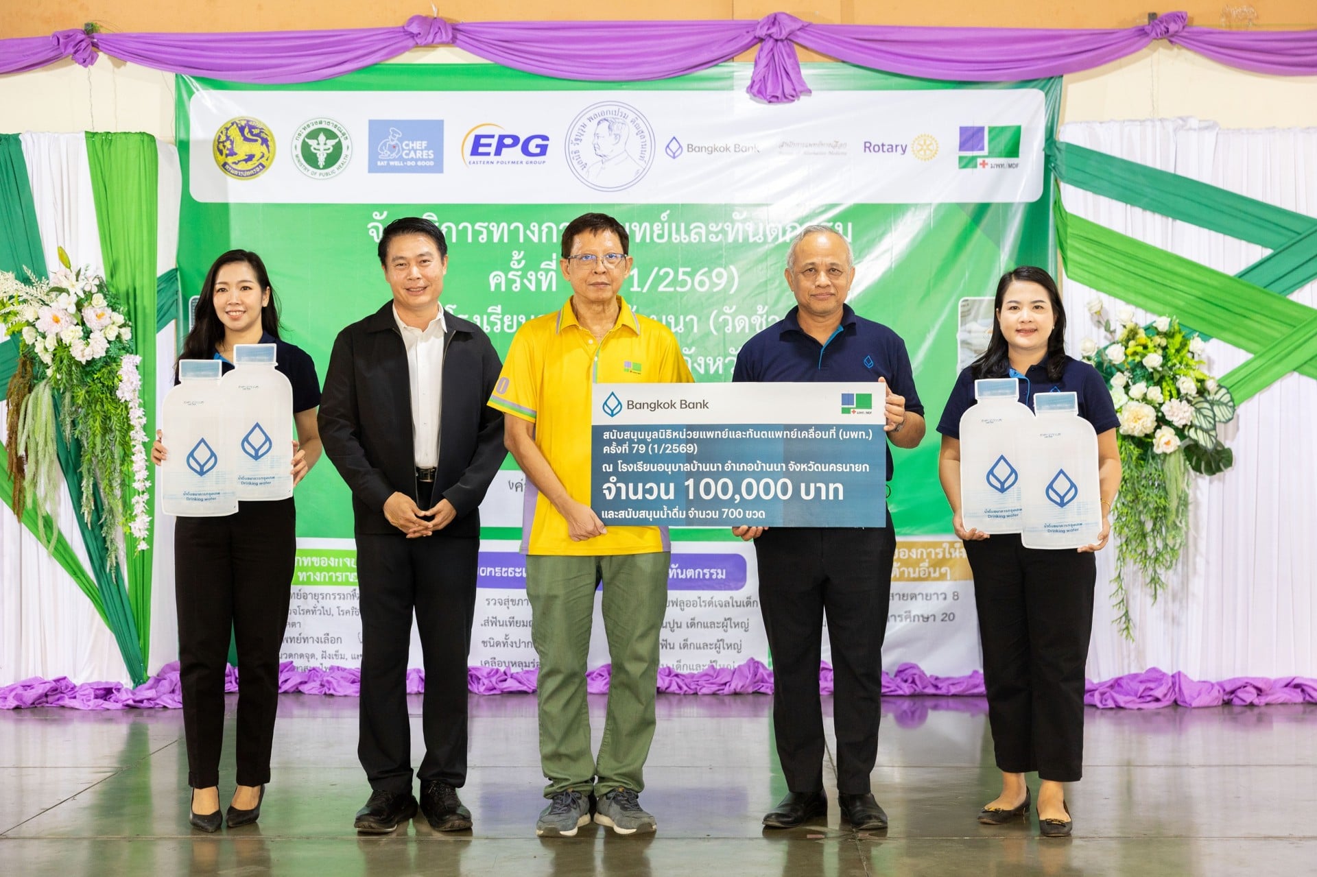 สุขภาพที่ดีขั้นพื้นฐาน - ธนาคารกรุงเทพ จำกัด (มหาชน) นำโดย นายสุวิทย์ อินทรเฉลิม เจ้าหน้าที่บริหารระดับ Vice President ฝ่ายการประชาสัมพันธ์ แพทย์หญิงศรีเพชร กาญจนกีรณา เจ้าหน้าที่บริหารระดับ Assistant Vice President บริการสุขภาพ พร้อมด้วยทีมแพทย์ เภสัชกร พยาบาล ผู้บริหารและพนักงานธนาคาร รวมกว่า 30 คน ร่วมลงพื้นที่เป็นอาสาสมัคร พร้อมมอบเงินสนับสนุน จำนวน 100,000 บาท แว่นสายตาสั้น-ยาว จำนวน 500 อัน น้ำดื่มจำนวน 700 ขวด และถุงกระดาษรีไซเคิลจากโครงการชุบชีวิตกระดาษใช้แล้ว จำนวน 5,000 ใบ สนับสนุนมูลนิธิหน่วยแพทย์และทันตแพทย์เคลื่อนที่ (มพท.) จัดกิจกรรมออกหน่วยแพทย์และทันตแพทย์เคลื่อนที่ ครั้งที่ 79 (ครั้งที่ 1/2569) เพื่อให้บริการทางทันตกรรม บริการตรวจรักษาโรคทั่วไป และบริการจากกลุ่มแพทย์ทางเลือก รวมทั้งมอบสิ่งของจำเป็นแก่ผู้ป่วยยากไร้และด้อยโอกาสในพื้นที่ชนบทและถิ่นทุรกันดาร รวม 2,431 ราย ณ โรงเรียนอนุบาลบ้านนา (วัดช้าง) ตำบลบ้านนา อำเภอบ้านนา จังหวัดนครนายก โดยมีทันตแพทย์ริม เกษสาคร ประธานมูลนิธิหน่วยแพทย์และทันตแพทย์เคลื่อนที่ เป็นผู้รับมอบ โอกาสนี้ร้อยตำรวจตรี สัณฐิติ ธรรมใจ รองผู้ว่าราชการจังหวัดนครนายก เป็นประธานในพิธีเปิด