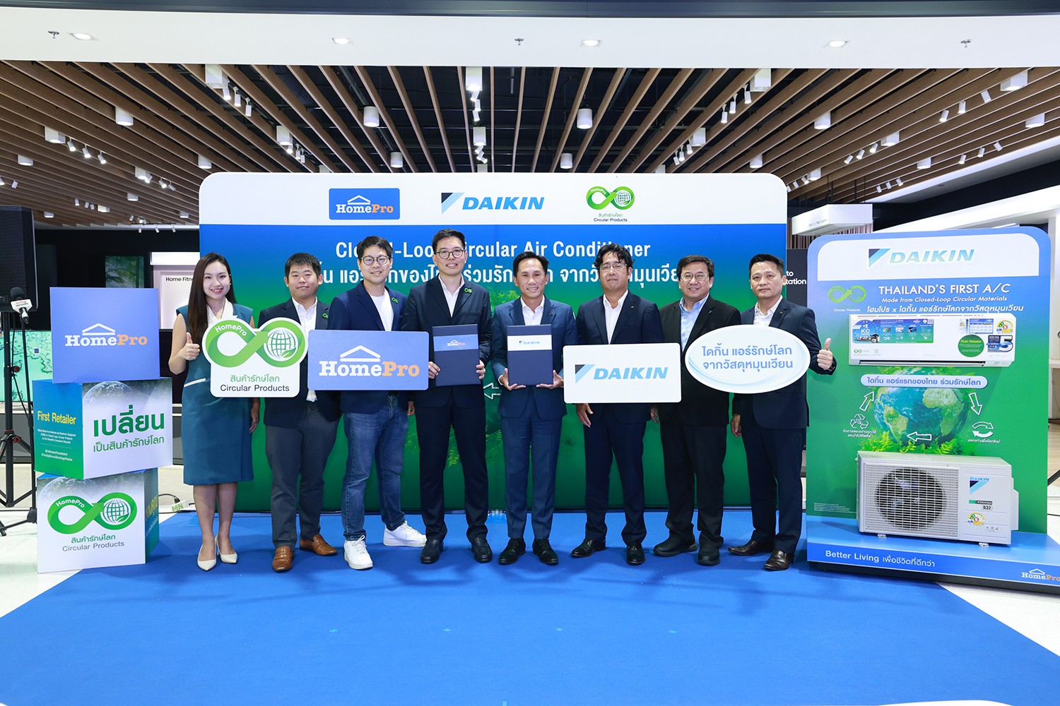 นายวรพงศ์ กียปัจจ์ กรรมการผู้จัดการ บริษัท สยามไดกิ้นเซลส์ จำกัด และ นายคาสุฮิสะ ฮินาสึ กรรมการบริษัท ไดกิ้น อินดัสทรีส์ (ประเทศไทย) จำกัด พร้อมด้วย นายอาเทพ พันธุ์อุทัยวัฒน์ ผู้ช่วยกรรมการผู้จัดการ บริษัท โฮม โปรดักส์ เซ็นเตอร์ จำกัด (มหาชน) เปิดตัว “เครื่องปรับอากาศรักษ์โลก” (Circular Air Conditioner) ครั้งแรกในประเทศไทย ภายใต้โมเดล Closed Loop Circular Product เปลี่ยนขยะจากโครงการ “แลกเก่าเพื่อโลกใหม่” ของโฮมโปร เป็นผลิตภัณฑ์เพื่อการอยู่อาศัยที่ยั่งยืนในชีวิตประจำวันของผู้บริโภค พร้อมวางจำหน่ายผ่านทุกช่องทางของโฮมโปรทั่วประเทศ สะท้อนบทบาทสององค์กรในการขับเคลื่อนนวัตกรรมที่ตอบโจทย์ประสิทธิภาพการใช้งานและความรับผิดชอบต่อสิ่งแวดล้อมไปพร้อมกัน โดยมี นายอนิรุทธ์ จินดาดำรงวนิช , นายณพล ก่อก้องวิศรุต นางสาวจริญญา ศรีประยูร ร่วมงาน ณ โฮมโปร สาขารังสิต
