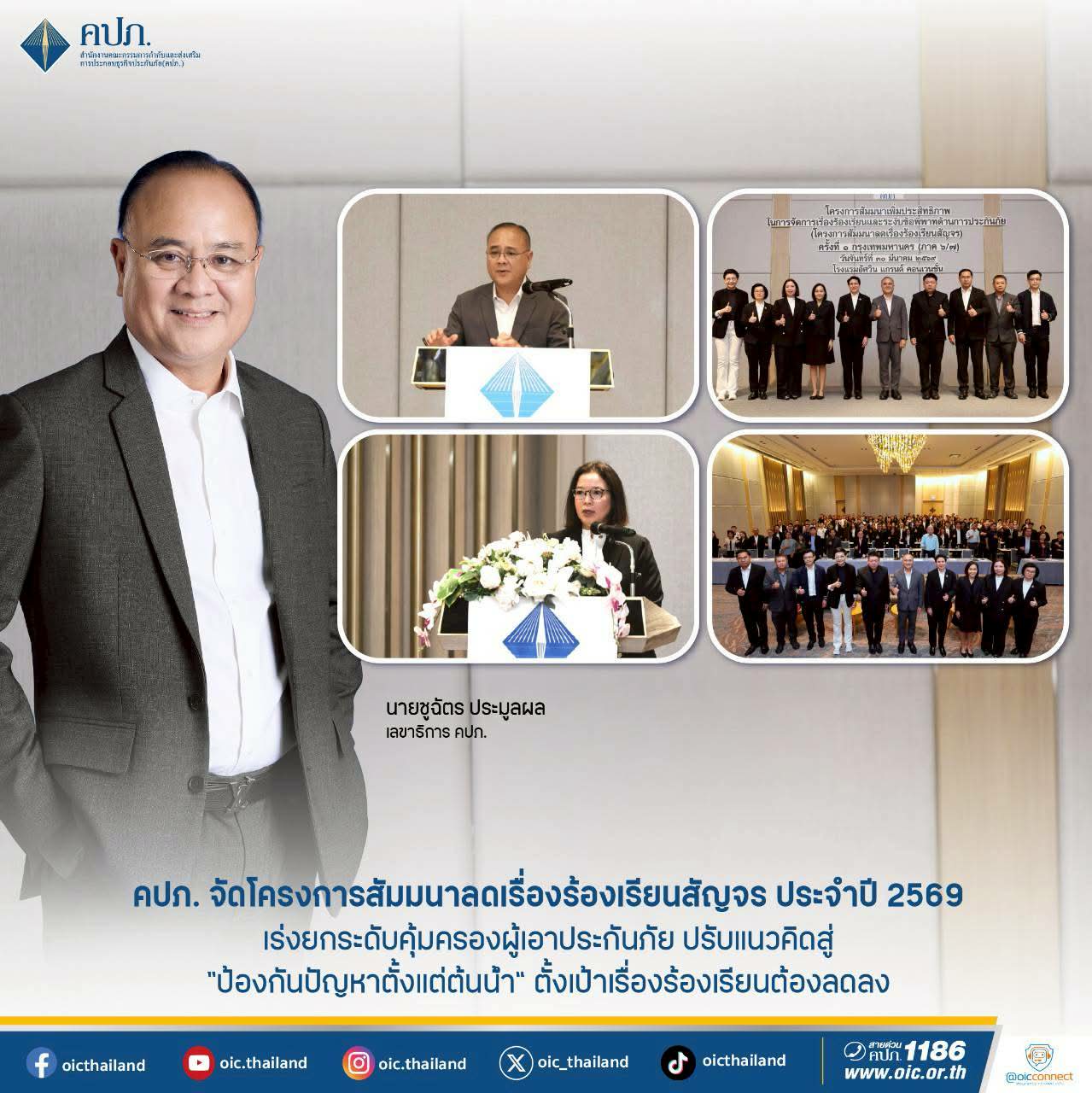 เมื่อวันที่ 30 มีนาคม 2569 นายชูฉัตร ประมูลผล เลขาธิการคณะกรรมการกำกับและส่งเสริมการประกอบธุรกิจประกันภัย (เลขาธิการ คปภ.) เป็นประธานเปิด “โครงการสัมมนาเพิ่มประสิทธิภาพในการจัดการเรื่องร้องเรียนและระงับข้อพิพาท ด้านการประกันภัย” หรือ โครงการสัมมนาลดเรื่องร้องเรียนสัญจร ประจำปี 2569 ซึ่งจัดโดยสายคุ้มครองสิทธิประโยชน์ ในรูปแบบ Hybrid ณ โรงแรมอัศวิน แกรนด์ คอนเวนชั่น และผ่านระบบออนไลน์ โดยมีผู้เข้าร่วมสัมมนาซึ่งประกอบด้วยผู้บริหาร และพนักงานของสำนักงาน คปภ. ทั้งส่วนกลางและส่วนภูมิภาคทั่วประเทศ รวมถึงผู้บริหารระดับสูงของบริษัทประกันวินาศภัย และผู้แทนของสมาคมประกันวินาศภัยไทย กว่า 200 คน เข้าร่วมสัมมนาอย่างพร้อมเพรียง โดยเลขาธิการ คปภ.จะเปิดโครงการสัมมนาพร้อมมอบนโยบายเกี่ยวกับการบริหารจัดการเรื่องร้องเรียนอย่างมีประสิทธิภาพแก่ผู้บริหารของบริษัทประกันวินาศภัย
