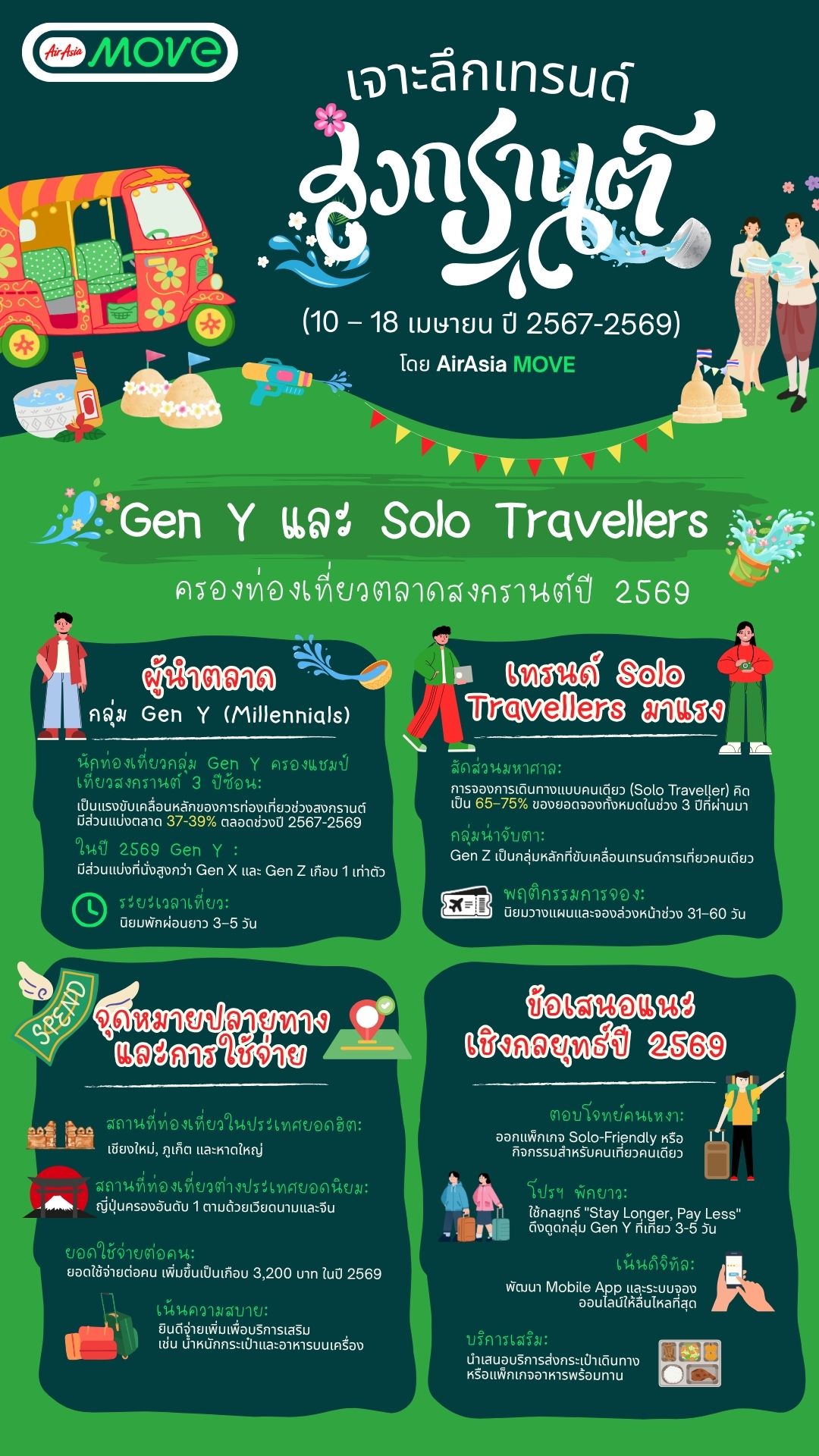 กรุงเทพฯ, 30 มีนาคม 2569 – AirAsia MOVE แพลตฟอร์มการท่องเที่ยวชั้นนำของภูมิภาค เปิดเผยอินไซต์ " Songkran Travel Trends (2567-2569)" วิเคราะห์พฤติกรรมการเดินทางท่องเที่ยวของคนไทยในช่วงเทศกาลสงกรานต์ (10-18 เมษายน) ตลอด 3 ปีที่ผ่านมา พบการเปลี่ยนแปลงที่น่าสนใจของนักเดินทางกลุ่มหลัก โดยเฉพาะพลังของ Gen Y (Millennials) และเทรนด์การเที่ยวคนเดียว (Solo Traveller) ที่พุ่งสูงขึ้นอย่างต่อเนื่อง